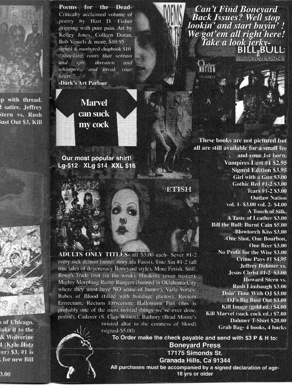 Rough Trade is a hard hitting, one-issue comic book published by Boneyard Press in April 1994 written by Lance Polin & published by Hart D. Fisher (who’s artwork is featured through out the book un-credited). Short stories “Next” (drawn by Denis Gulbey), “Forgiveness” (drawn by Jason Karns), “Glassy Eyed” (drawn by Jason Karns). This is a very very very hard core horror book, but not in the Terrifier way you’re expecting. These copies are extremely hard to find & worth the hunt. This is a truly disturbing book by the kings of “Outlaw Comics”, Boneyard Press’s pack of wolves.